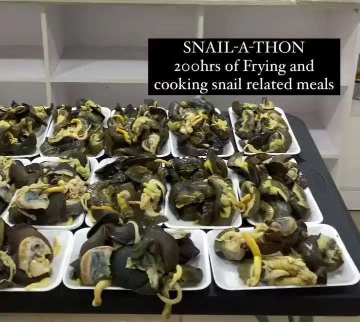 Amidst the frenzy, innovative concepts have emerged, each aspiring to leave a unique mark. The latest sensation captivating online platforms is the 200-hour Snail-A-Thon, where an audacious lady embarks on an unprecedented cooking marathon, dedicating eight consecutive days to frying snail-related delicacies.